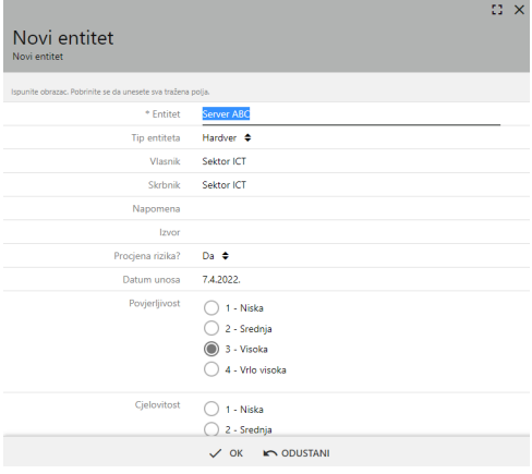 By clicking Add Entity, a form opens for adding a new entity. Users can input the entity name, type, notes, source of information, whether a risk assessment is required for the entity (Yes/No), CIA parameter values (Confidentiality, Integrity, Availability), and assign an owner/custodian and administrator for the entity. The entry date is automatically set to the current date.